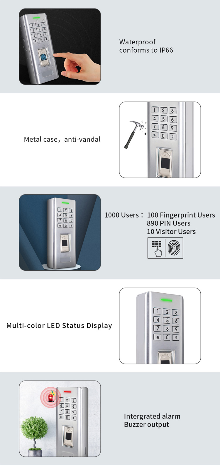 La versión resistente al agua IP66 es muy adecuada para uso en exteriores. El dispositivo admite hasta 100 usuarios de huellas dactilares y 900 usuarios de PIN, se puede operar fácilmente a través del teclado y el maestro.