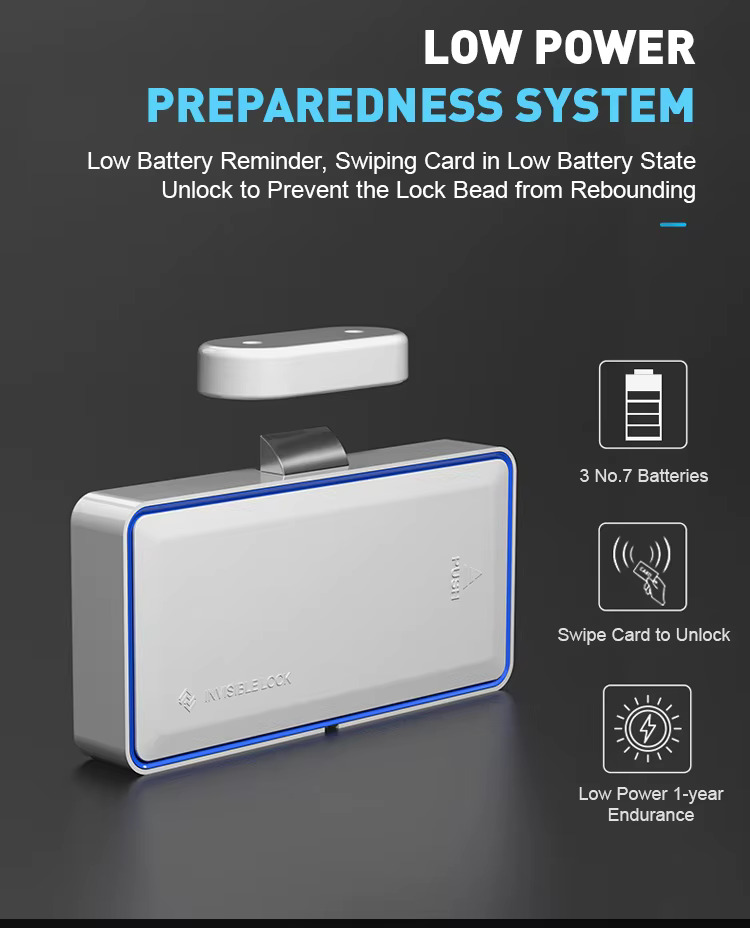 Una cerradura invisible RFID para cajones está diseñada para proteger cajones, armarios o compartimentos mediante tecnología de identificación por radiofrecuencia (RFID), permaneciendo oculta a la vista. Su objetivo principal es proporcionar un control de acceso cómodo, seguro y discreto en diversos entornos.